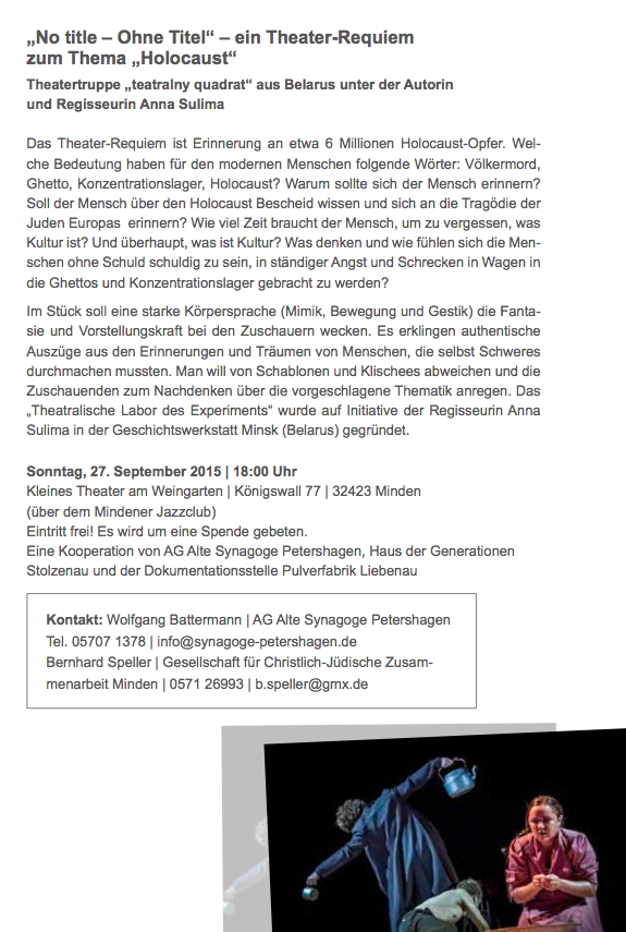 Ein Theater-Requiem zum Thema „Holocaust“ der Theatertruppe „teatralny quadrat“ aus Belarus unter der Autorin und Regisseurin Anna Sulima